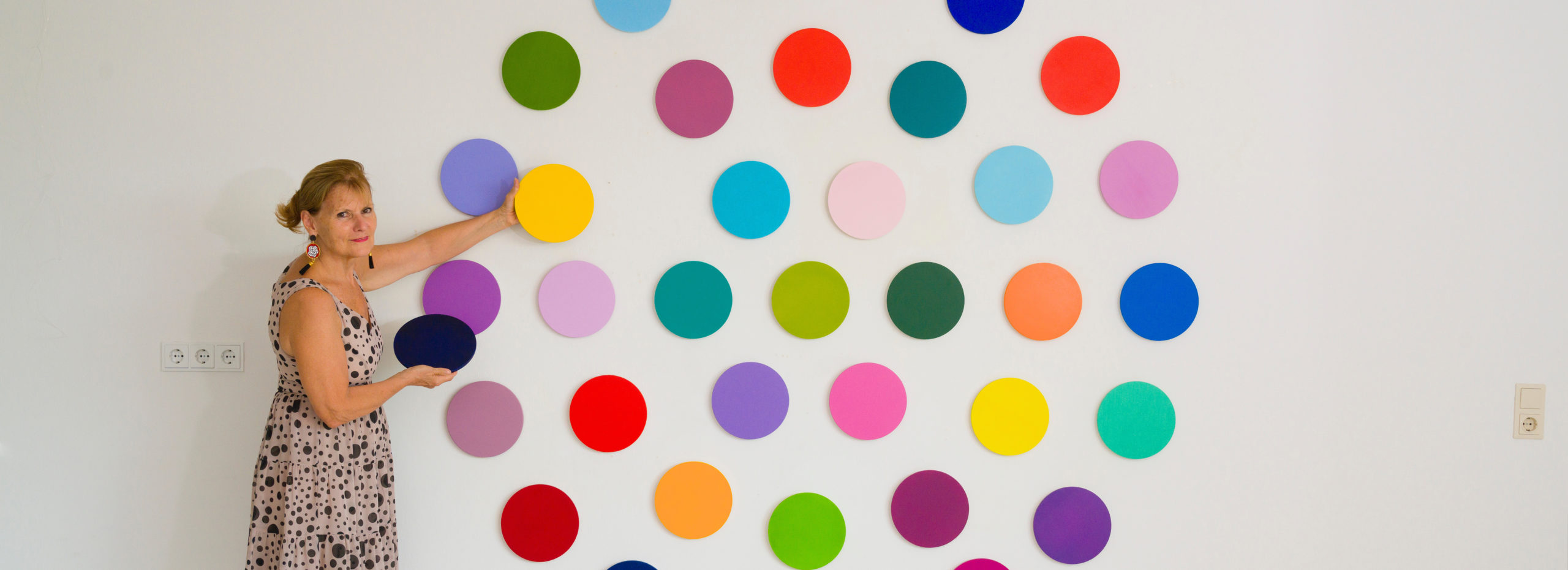 Hierbei geht es einzig und allein um das Thema „Farbe“ und noch präziser um deren Wirkung. Die Arena dieses „Schau-Spiels“ ist das Quadrat, der Protagonist ist der Kreis. In diesem Sinne trifft sich die Intention der Künstlerin mit Mark Rothkos Bildbegriff.