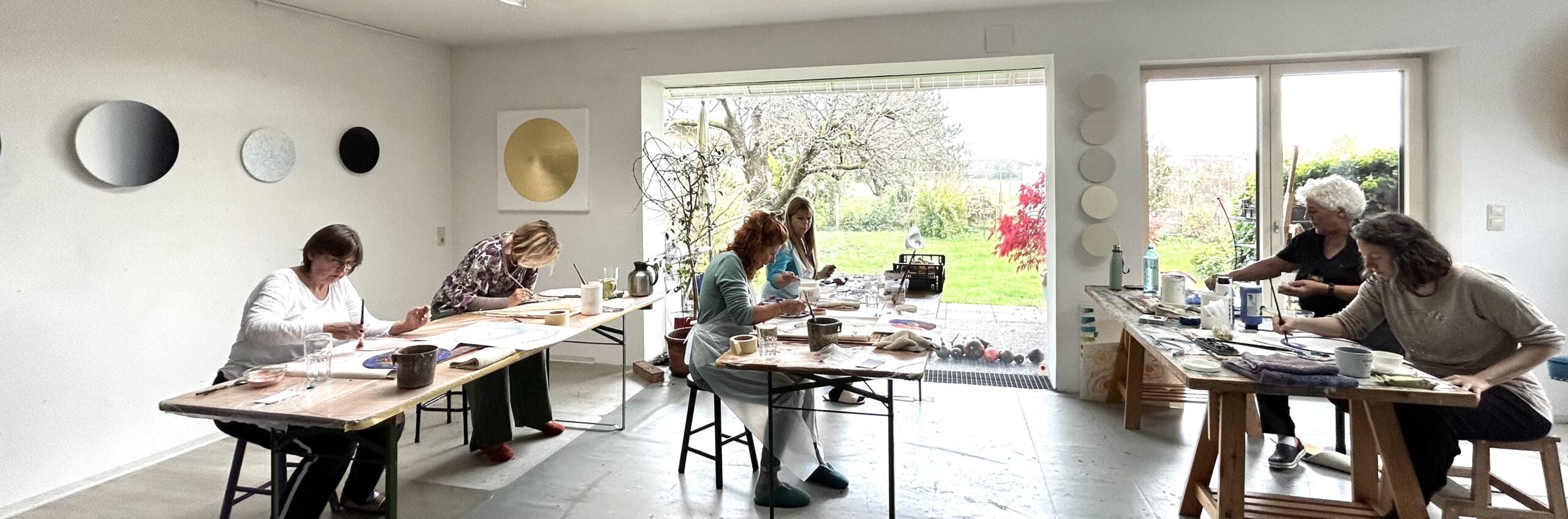 Meine Seminare verbinden Intuition und fachkundige Anleitung. Wir arbeiten mit einer Vielfalt an Materialien: Alles steht im Atelier bereit, sodass du dich aufs Malen konzentrieren kannst. Die Gruppen sind kleine, sodass ich auf jede Person eingehen kann – egal ob du Anfänger bist oder schon länger malst. Nach dem ersten Eintauchen zeigt sich oft schon von selbst, wohin die Reise geht: Manche bleiben bei abstrakten Farbflächen, andere entwickeln Ideen für figurative, realistische Motive. Beides ist Willkommen. Entscheidend ist der Weg, dass du in den Flow, ins Spielen und Ausprobieren kommst.